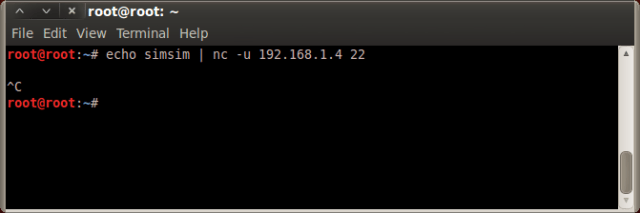 To trigger the password we simply use netcat with the -u (for UDP) option and include the password.  The default password is simsim which is defined in simsim.c.  To take up fewer system resources (CPU & Memory) simsim currently only monitors UDP port 22, which means we’ll rarely be inspecting packets that are not in fact sent by us.  This of course can be changed by changing the BPF filter in simsim.c.